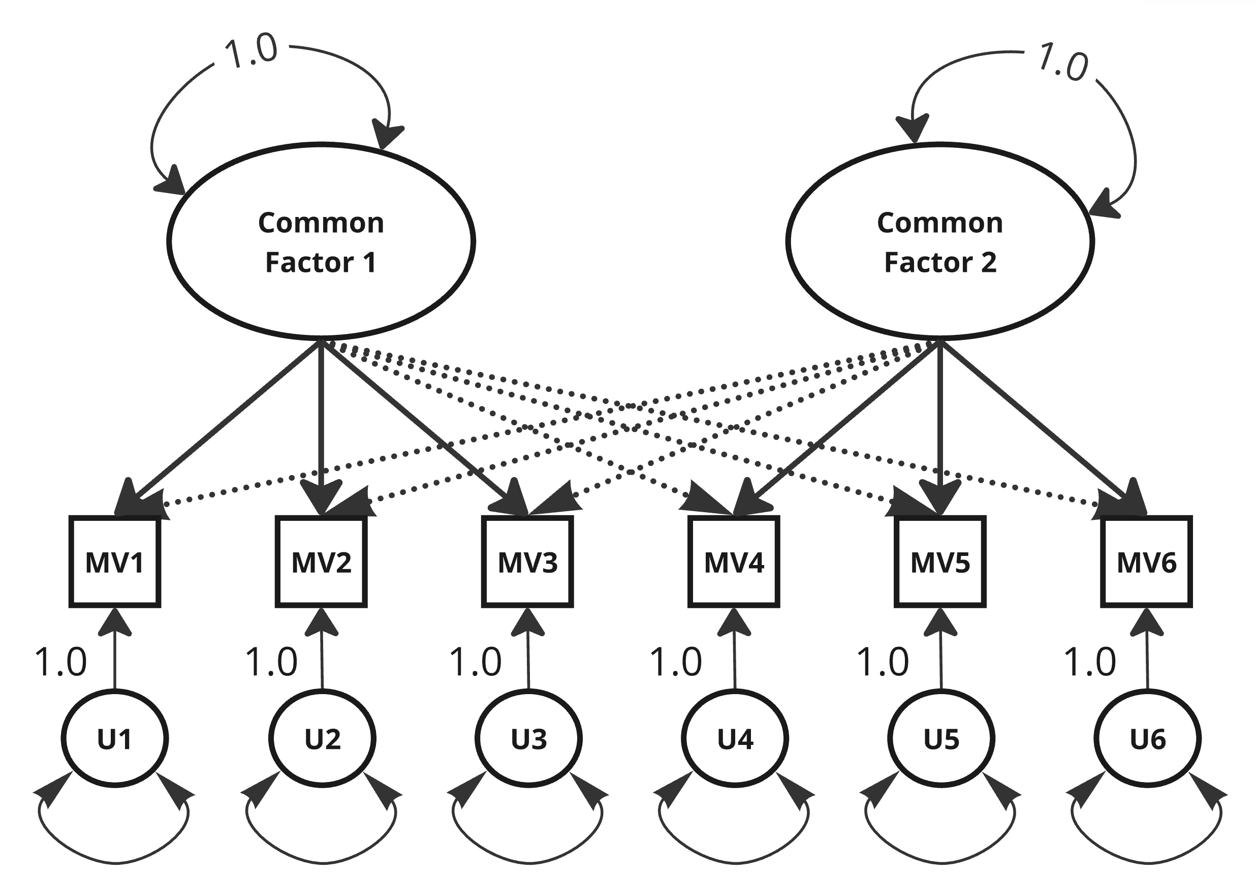 \(\rightarrow\) Parsimoniously represent the structure of correlations between measured variables (MVs; e.g., questionnaire, aptitude test, etc.) to a smaller set of common factors (CFs; latent variables).